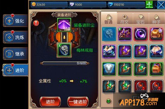 需要注意的是,不同等级不同品质的装备,可进阶的阶数不同,等级越高、品质越高的装备,能够进阶的极限更高。