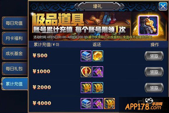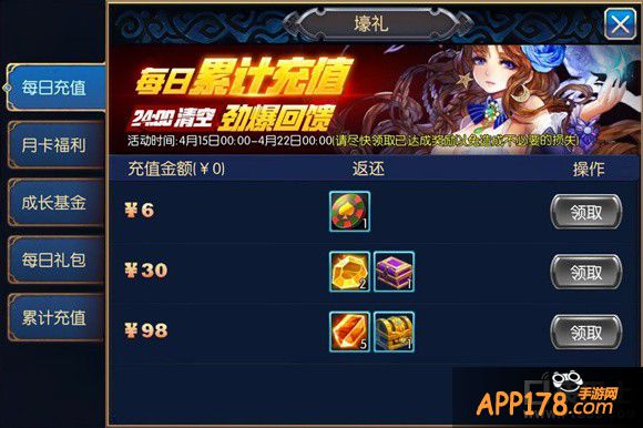 点开豪礼按钮,果然与充值有关,居然是充值返还系统。游戏厂商良心的设定,充的越多返还物品的价值越高。有些返还物品甚至超过了充值的金额。那么我们就来看看具体的豪礼返还物品的截图吧。
