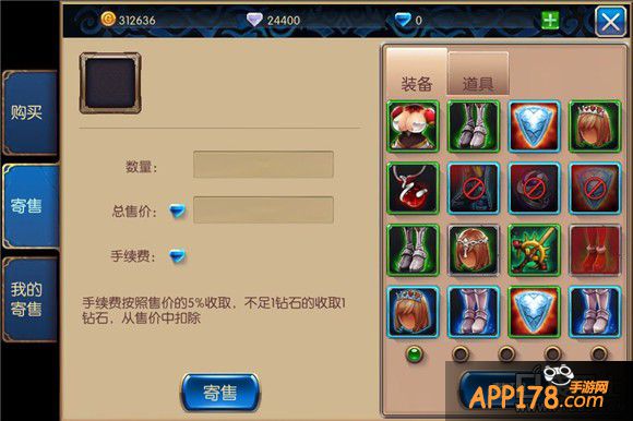 寄售装备时,将装备数量以及所要出售装备的价格输好,之后点寄售就行,每一件装备寄售成功,系统会从装备售价中提取5%的手续费。不足1钻石的收取1钻石,从售价中扣除。