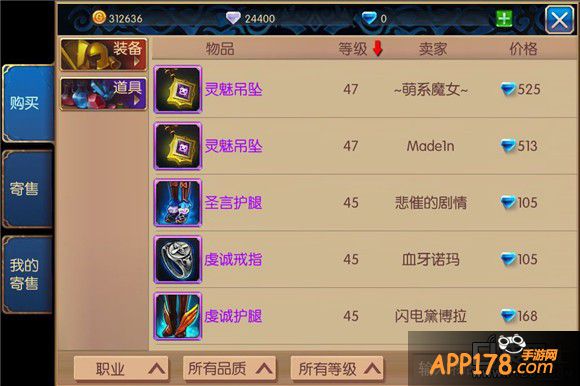 其他玩家挂在寄售行中的装备和道具,玩家可以浏览并购买。后面的价格就是玩家实际的购买价格。