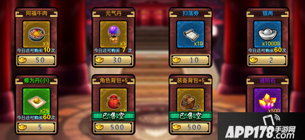 元宝商店:售卖的是同福牛肉(体力药),元气丹,扫荡卷,银两,修为丹,进阶石等物品,价格也还算公道,推荐指数五颗星!