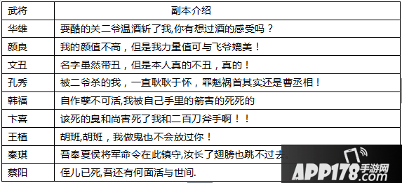 过关斩将需要玩家挑战9大三国里的武将,依次为华雄-颜良-文丑-孔秀-韩福-卞喜-王植-秦琪-蔡阳,领取任务时挑战的武将不一样但是总的挑战数量和武将会一致。
