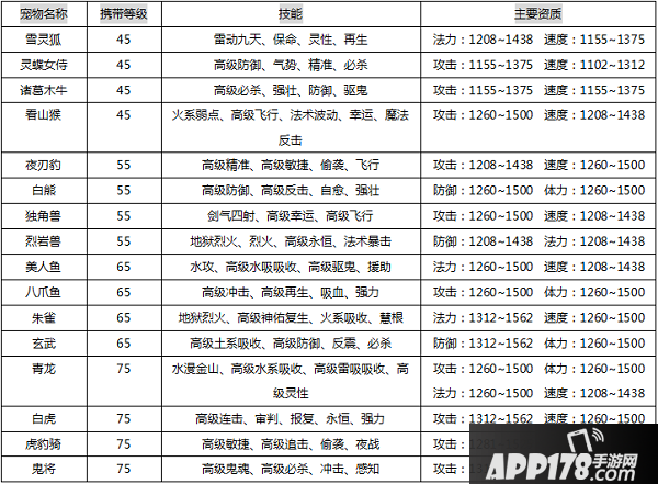 65级宠物比较尴尬,因为离45级已经有段距离了,宠物资质和成长(隐藏属性)有了比较大的提升,但是这批宠物都只有4个技能格子,有兴趣的玩家可以选择朱雀和玄武进行培养,如果45级的宠物培养得比较逆天,可以直接冲到75换新宠。