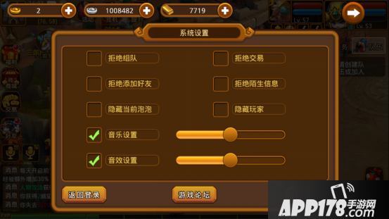 游戏中可以通过系统设置来调整画面、声音方面的一些属性和某些状态的设定。其主要功能包括拒绝组队、拒绝交易、拒绝添加好友、拒绝陌生信息、隐藏当前泡泡、隐藏玩家、音乐设置、音效设置、游戏论坛、提交问题、及返回登陆功能。