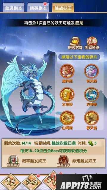 【奋力一击】虽然消耗大,可是杀伤力也远远超过普通【战斗】,建议大家优先使用。一次击杀妖王失败不必着急,多打几次磨血终能斩杀。实在打不动还可以【全服助阵】喊打手来帮忙。总共击杀6次遗迹守卫就可以触发大BOSS应龙了,这货掉落的可都是紫色宝物碎片啊。