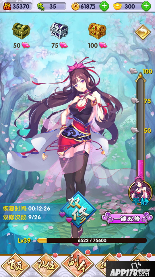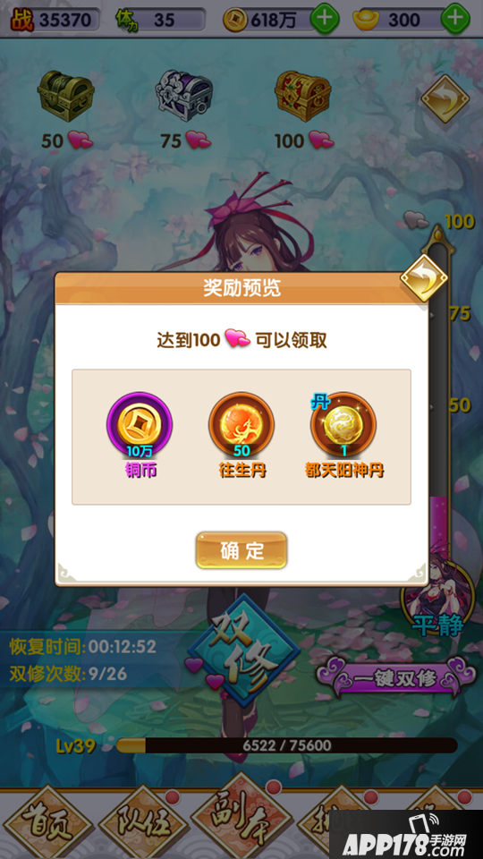 同时达到50、75、100的双修进度,还可以领取一次宝箱奖励,获取大量铜币和修炼丹