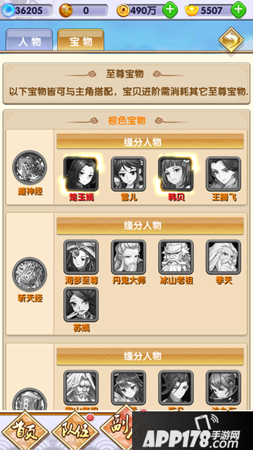 宝物分橙色,紫色,蓝色,收集指定武将,可通过缘分系统激活对应的宝物