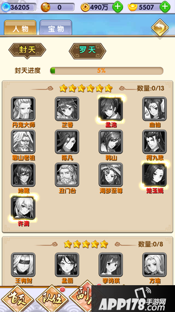 人物分封天,罗天,每个板块有13个6星武将,8个5星武将,10个4星武将,6个三星武将,5个二星武将,集齐84个武将,多么有成就感哦!