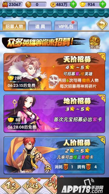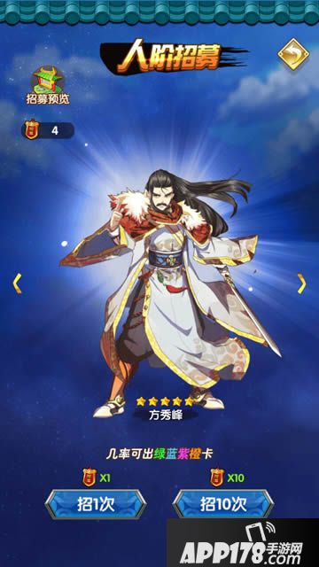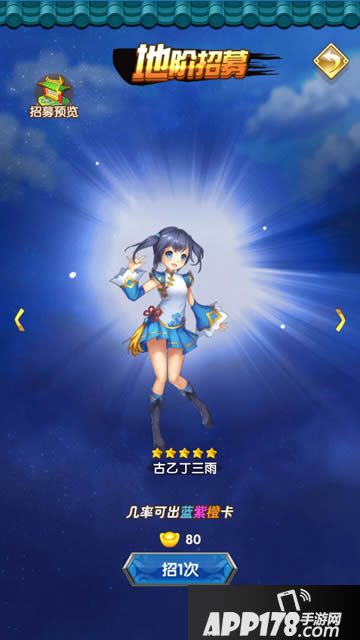 花费80元宝招募一次。有几率开出蓝紫橙卡。每天一小抽,总有一天能抽到橙卡。小投入大回报。