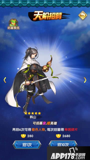 花费280元宝可招募一次,话费2680元宝可招募十次。十次必出橙色英雄,强化队伍首选天阶招募