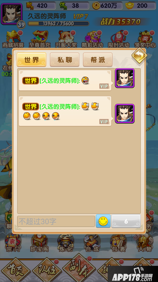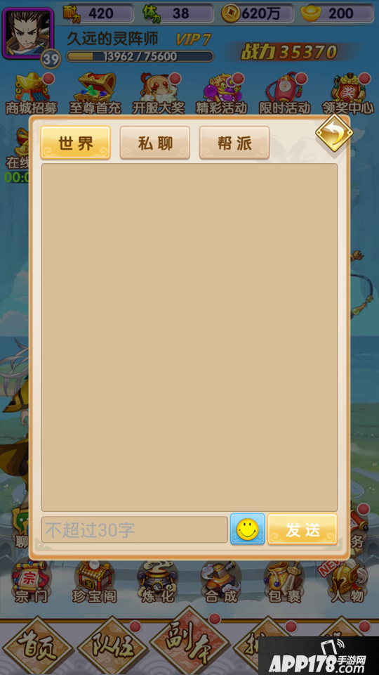 聊天共分为“世界”、“私聊”、“帮派”三个频道