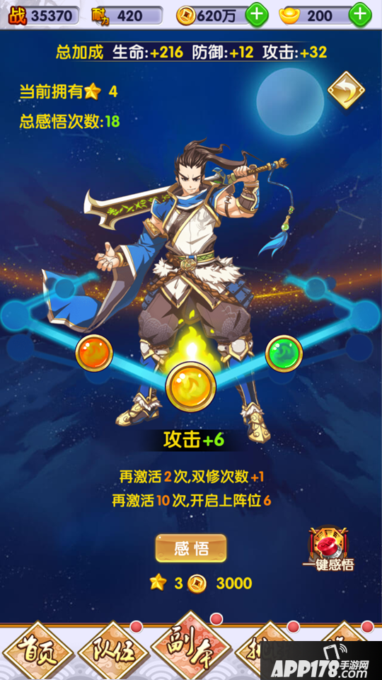 感悟成功后,可提升生命、防御和攻击属性,属性对所有队员均有加成效果