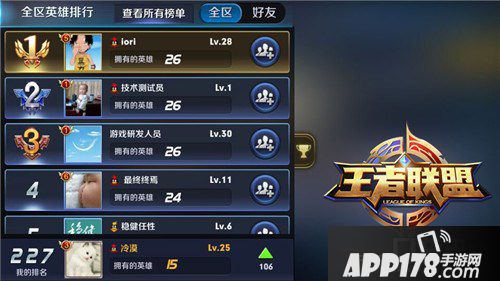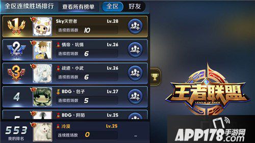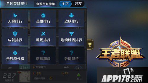 单说排行榜,第一联想是关于战斗力的高低。而在《王者联盟》里排行榜的种类可是繁多到眼花。这不就目前的数数下来竟然有七种榜单,分别是天梯排行、英雄排行、皮肤排行、成就排行、胜场排行、连续胜场排行、贵族积分榜。而排行榜的排名又细分到全区和好友,因此光在好友榜上位列前茅可是不够的,最终还是要和全区的召唤师来个大比拼。