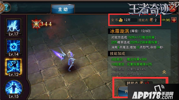 点击技能菜单后,花费金币和技能点进行技能的升级,技能级别越高所需要的技能点和金币越高,技能点不够时可以用钻石进行购买,每天购买次数有限。