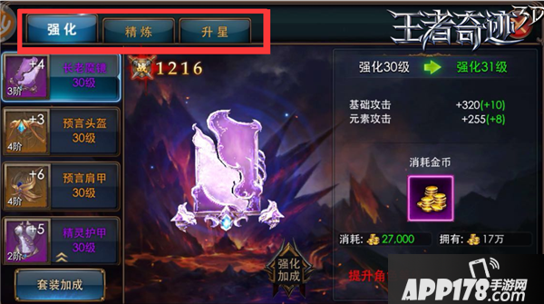 点击锻造菜单后,可以对装备进行强化,精炼和升星三种操作。其中精炼和升星需要相对应的材料,可通过攻击Boss获得。