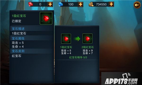 集齐一定数量的宝石精华,点击装备的宝石,消耗同类型宝石精华可对宝石进行升级,升级后的宝石属性会得到提升。