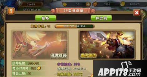 这是英雄升级的主要方式之一,修炼馆中的修炼分为两种:普通修炼和高级修炼。普通修炼一次最多10小时,只需要花费金币,可以获得少量金币。而高级修炼最多一次可以24小时,可以获得大量经验,不过需要消耗点劵获得元宝。