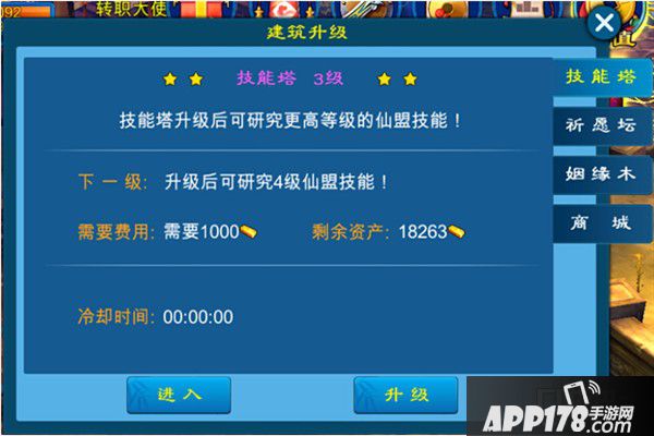 2、建筑升级受仙盟等级限制,若仙盟3级,那么建筑最高也只能升到3级。若满足升级条件,则成功升级,仙盟频道提示:恭喜技能树建筑成功升级到XX级;