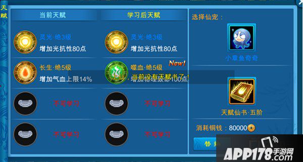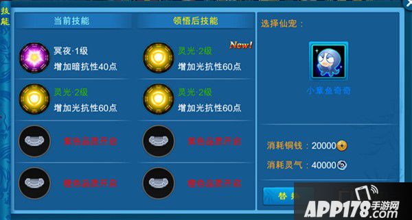 根据仙宠品质不同,可领悟技能的数量也不尽相同。领悟技能需要消耗一定的铜钱和灵气,新领悟的技能将随机生成,可以选择是否替换。