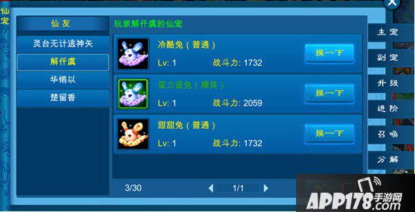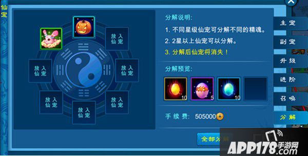 绿色及以上品质的仙宠可以进行分解,仙宠分解后,可获得相应的仙宠精魄或灵南仙果。