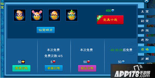 召唤仙宠共有5种方式,分别为普通召唤、卓越召唤、极品召唤、完美召唤和完美十连。