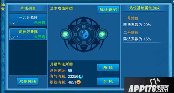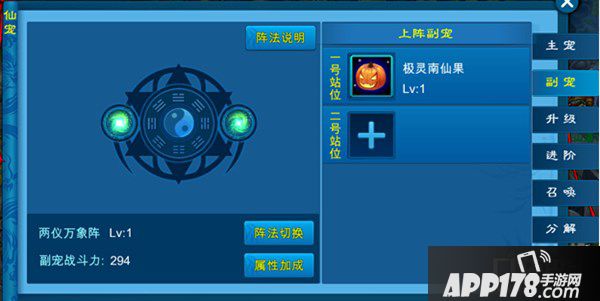 使用阵法书,即可习得相应阵法,学会阵法后,即可在副宠界面中开启指定阵法,并在阵法空位放入仙宠,放入的仙宠星级越高,阵法所对应的固定属性加成也就越多。放入阵法中的副宠属性将会叠加角色身上,并且根据阵法等级有所加成。主宠不能放入阵法当中,同一阵法只能放入一只同种类仙宠。花费一定铜钱和真气对阵法升级,可以增加副宠属性加成效果!