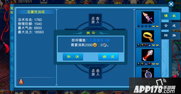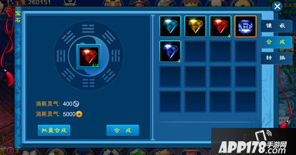 低级宝石可以合成高级宝石,合成方式为四合一。每次合成需要消耗铜钱和灵气值。合成的宝石等级越高属性则越强。