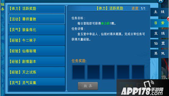 日常任务将会每日进行刷新,在日常任务中,每日登录即可领取一瓶体力药剂;完成不同任务后还可获得海量经验和金钱!