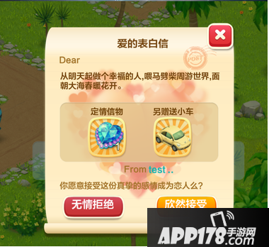 一、首先玩家要达到13级.然后系统会提示你可以建造恋爱盒子.在购物篮那里购买恋爱盒后,建造成功需要50感谢信,双方彼此亲密度达到200,点击恋爱盒就可以向对方表白。表白需要99朵玫瑰和戒指,各位恋人要提前准备好玫瑰花和宝石,表白也可以选择不同的钻石.(有不一样的惊喜噢)。完成上述步骤后就可以结婚拉。结婚后彼此可以托管彼此的庄园,结婚后恋爱盒会成为情侣仓库。