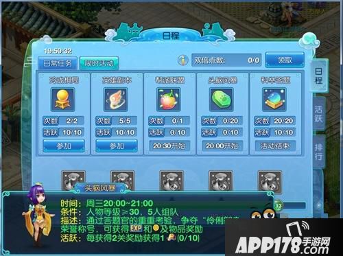 “头脑风暴”顾名思义,可是需要每一个童鞋都出谋划策的哦!每一位童鞋都需要进行答题,而且也有时间限制,答错有一次机会,如果都答错了...那就只能接受战斗惩罚啦!总共有20关,每关5道题,不管是自己答对亦或是队友答对都有经验值奖励哦!另外轮到自己时,回答题目获得经验值更多,且更可能获得物品奖励。当回答完全部题目时将出现系统提示,显示队伍通关的时间。最后统计用时最短的前3名队伍将获得特殊称谓“伶俐智者”!