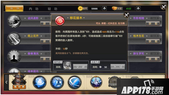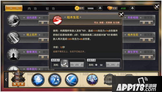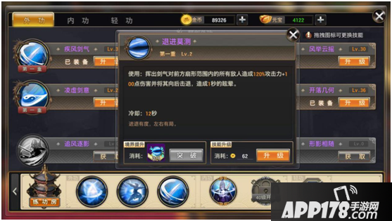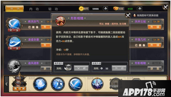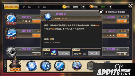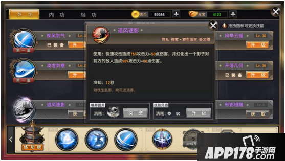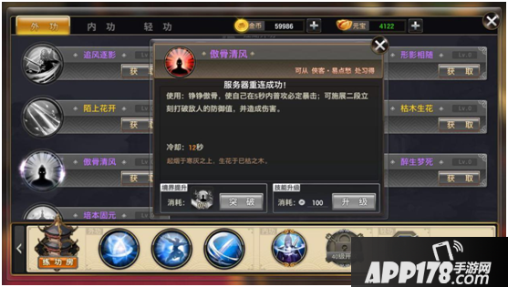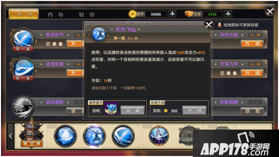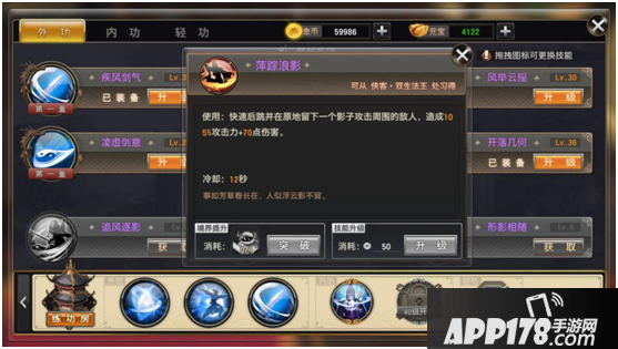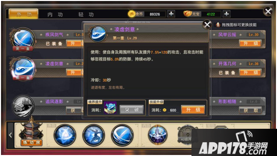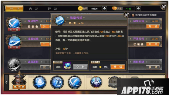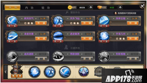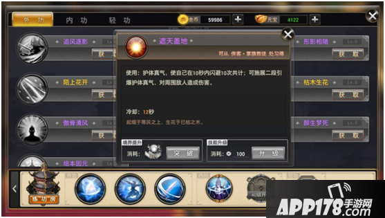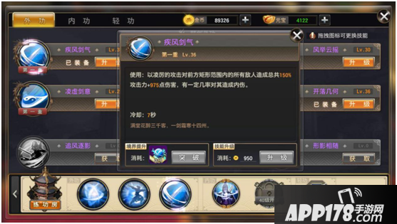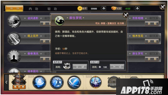 第二部分(江湖外功)通过侠客学习,通过使用对应武学秘籍提升境界,使用金币提升技能。