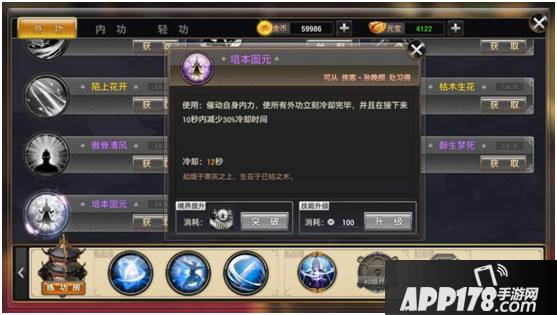 培本固元:催动自身内力,使所有外功立刻冷却完毕,在接下来的10秒内减少30%技能冷却。可通过侠客(孙晚照)习得。