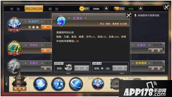 玄清诀:力道、身法、体质、元气、攻击、生命、所有外功的冷却降低。可通过侠客(易青青)习得。