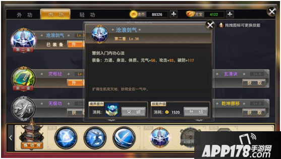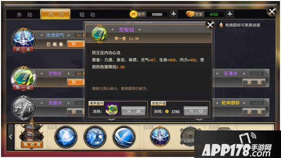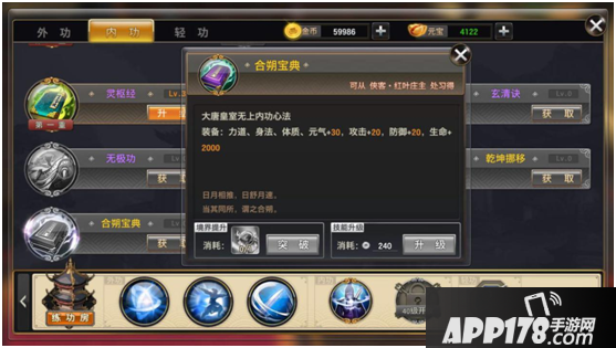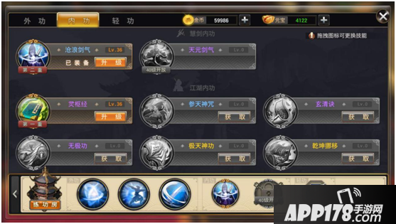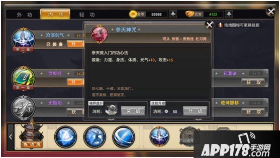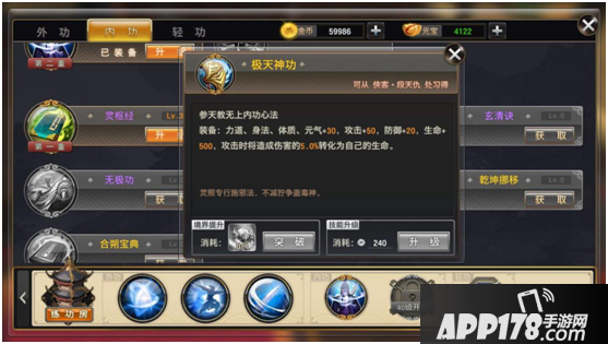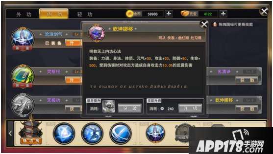 第二部分(江湖内功)通过侠客学习,通过使用对应武学秘籍提升境界,使用金币提升技能。