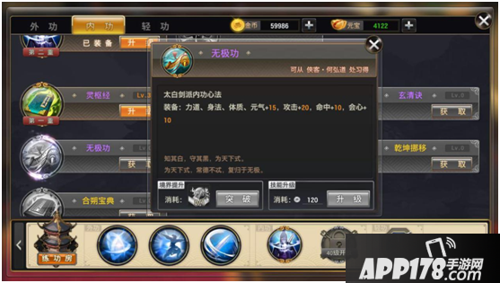 无极功:力道、身法、体质、元气、攻击、命中、会心。可通过侠客(何弘道)习得。