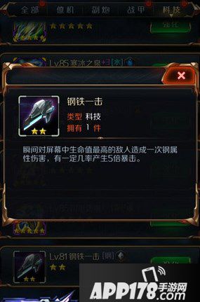 科技之中钢铁一击的定位是前期存在,因为钢铁一击的科技是以机甲的攻击来判定的,并不是以装备。这个数据在前期产生5倍暴击伤害是个非常大的伤害,前期能够起到很好的效果,但是在后期因为敌人实力的上升,关卡的难易度,造成就算产生了效果也并不能起到太大的一个效果,所以它在后期的伤害能力并不值得让玩家来进行选择。