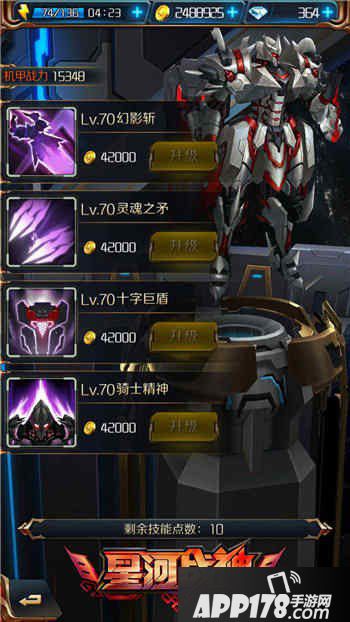 初始技能为“幻影斩”,也就我们所说的机甲必杀,能以极快的速度对敌人进行7次斩击,适用于与Boss战斗,而且机甲必杀的使用能够消除全屏弹幕,也是一种躲避致命子弹的方式。绿色品质机甲会解锁灵魂之矛,能让钢铁骑士的单体伤害得到强化,能在战斗中更为快速的击落敌机。蓝色品质会解锁十字巨盾,在暴走期间能获得4个围绕自身旋转的护盾;既能阻挡子弹的攻势,并且在此基础上进行反击,是个相当不错的防御技能。最后紫色品质解锁骑士精神,生命值降低会提高攻击力。玩家可以控制好机甲的血量,适当的挨子弹降低血量来触发这个技能得到高额攻击力,进而快速结束战斗。