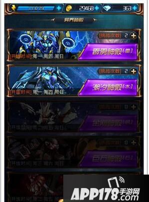 异界神殿中的神殿数量则增加了非常多,分别有:霹雳神殿【雷】、潮汐神殿【水】周一、周四开放。金刚神殿【钢】、烈焰神殿【火】周二、周五开放。巨石神殿【石】、暴风神殿【风】周三、周六开放。周天则全部神殿开放。每个神殿会掉落相同属性装备的材料。挑战神殿所需的等级都是一样的,简单25级,中等40级,困难50级。