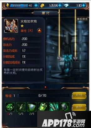 进入到装备中,点击想要装备的强化按钮,进入到装备的详细界面中,我们可以在右下角看到进阶按钮,点击便会显示出改装备进阶前和进阶后的属性对比,当然材料不足时并不会显示,只会提示材料不足!