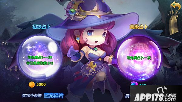 用游戏币进行占卜,占卜一次为5000金币,每天有5次的免费的机会哦,千万不要错过;不只有占卜一次的,还有更为快捷的占卜10次的抽取按钮,不仅可以获得必送蓝宠碎片,而且价格上面也有折扣。