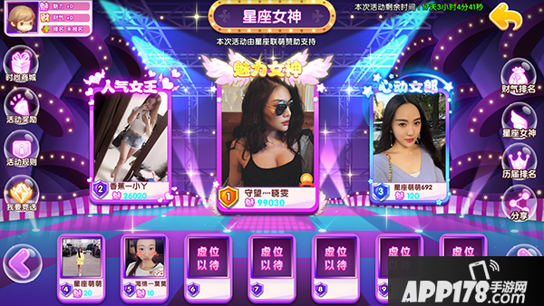 除了在游戏中打怪升级,我们来玩点新鲜的,送女神礼物可以获得土豪称号(加激活属性的),给女神评选,通过评选的女神可以获得全服唯一的时装翅膀和闪瞎小编双眼的称号,搞得我都想变性了(因为百分百认证,拒绝人妖)。