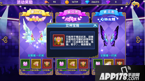 除了在游戏中打怪升级,我们来玩点新鲜的,送女神礼物可以获得土豪称号(加激活属性的),给女神评选,通过评选的女神可以获得全服唯一的时装翅膀和闪瞎小编双眼的称号,搞得我都想变性了(因为百分百认证,拒绝人妖)。