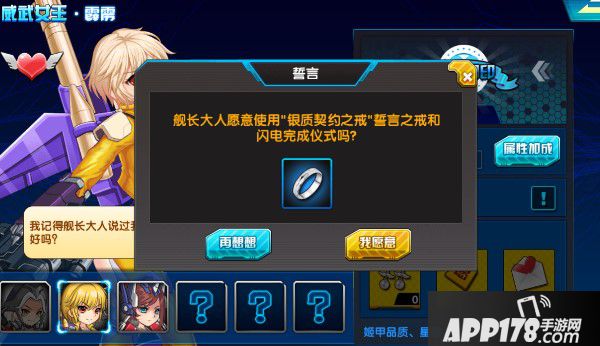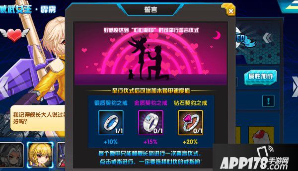 在千姬堂中,当你与一位战姬的好感度达到了。。。。额。。。羞羞的地步。。。其实就是心心相映啦。你就可以拿着戒指,单膝下跪求婚啦。