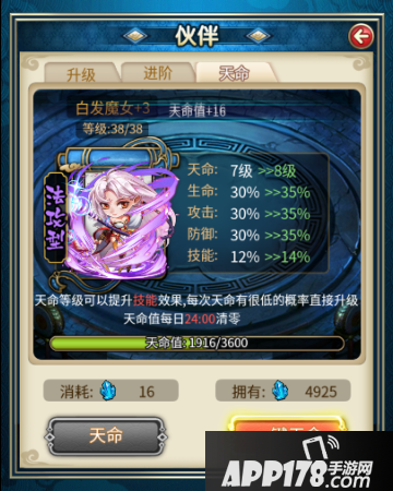 点击“天命”选项,我们就进入了天命升级的界面。在这里我们可以看到,天命会为伙伴提高生命、攻击、防御三大基础属性,每升一级天命会提高5%的相关属性数值。提升的比例相当可观,对于资质较高的橙卡而言,这种百分比的提高无疑是更加具有优势的。