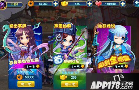 游戏中抽卡分为初出茅庐、声震仙界、仙剑传说三个等次。