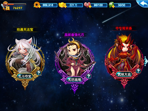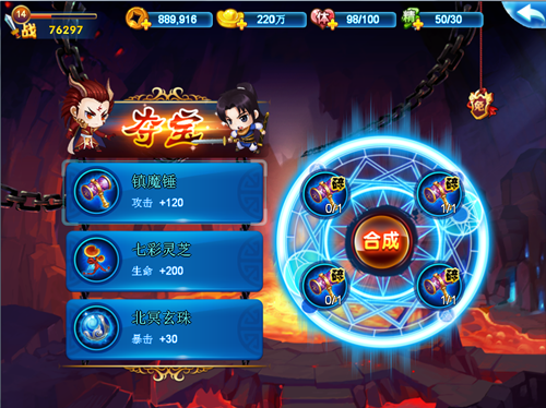 通过夺宝可以获得增加攻击、防御、血量、暴击属性的法宝,不同品质的法宝需要抢夺到不同数量的法宝碎片才能进行合成获得。