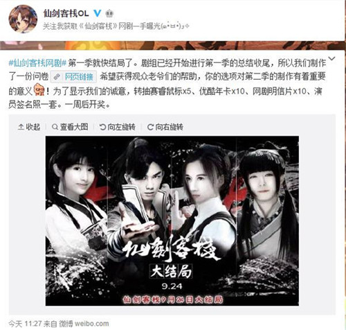 剧组已经开始进行第一季的总结收尾,也因此制作了一份问卷,点击阅读原文即可填写,希望广大观众能抽出一点宝贵的时间来填写,你的选项对第二季的制作有着重要的意义!网剧官方微博@仙剑客栈OL 在新浪微博开展了转发问卷微博抽奖