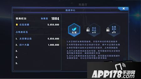投资界面中,你将了解到当前太空港的发展情况及本军团的投资情况。选择了合适的投资金额之后,点击投资按钮即可完成投资了。