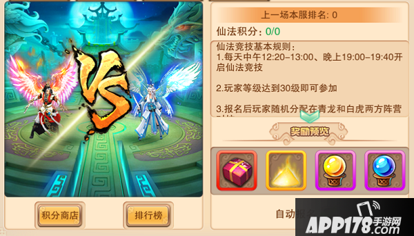 仙法竞技是全服分阵营对抗的单人在线PK玩法,玩家只要达到一定的等级就可以参加。