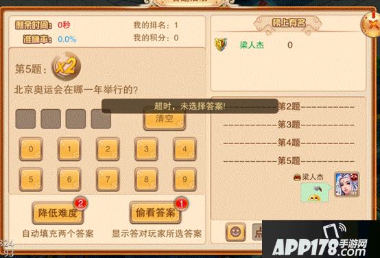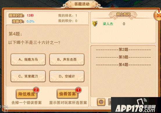 在答案选项下方有“降低难度”以及“偷看答案”两个按钮。“降低难度”按钮点击就会去掉一个错误答案,能够使用两次;“偷看答案”则需要有玩家回答正确之后才能使用,使用之后能够看到回答正确的玩家的答案。